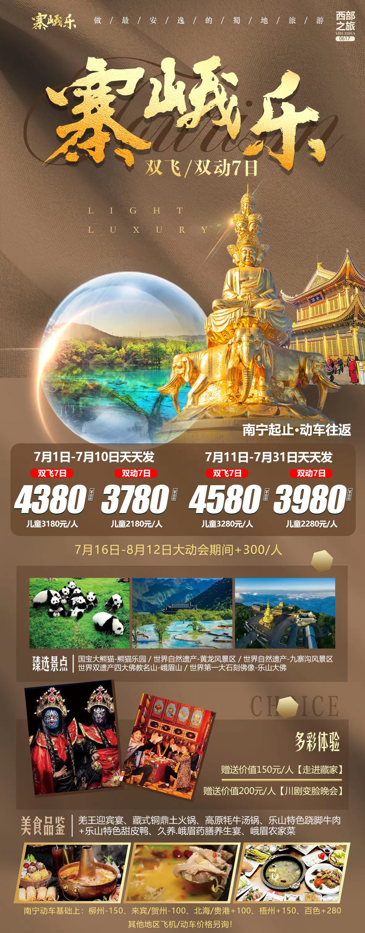 早餐后乘车前往乐山,开始主题活动—看大佛拜大佛:游览“山是一尊佛,佛是一座山”的世界第一大佛《乐山大佛》又名凌云大佛,开凿于唐玄宗开元初年,端坐于岷江,青衣江,大渡河三江汇合之处。先后历时 90 年才告完成,佛像高 71 米,比号称世界最大的阿富汗米昂大佛(高 53 米)高出 18 米,是名副其实的世界之最,1996 年被评为人类自然与文化双料遗产。登唐朝时修建的九曲栈道,远眺灵宝塔,后参观三江汇合,千年古刹凌云寺,远眺灵宝塔,经过东坡读书楼后。随后享用乐山特色午餐--翘脚牛肉,午餐后前往佛教圣地休闲天堂—峨眉山,抵达后自由活动。 品尝当地养生餐-【久养.峨眉药膳养生宴】,观看汇集全川的民间艺术精品的【川剧变脸晚会】。彝族舞蹈,皮筋,吐火,魔术,舞蹈乖幺妹儿,变脸,皮金滚灯等节目,大约50分钟,让您全方位领略无与伦比的经典民间绝艺,真切感受古蜀文化的博大精深。让此次旅行有颜有味。 温馨提示:部分景区为佛教景点,提供各类佛教佛事参拜祈福香蜡、点灯、求平安、佛物开光、法物流通等配套服务,非我社安排,请慎重选择(此等项目非旅行社安排购物点,不属于旅行社质量范围)